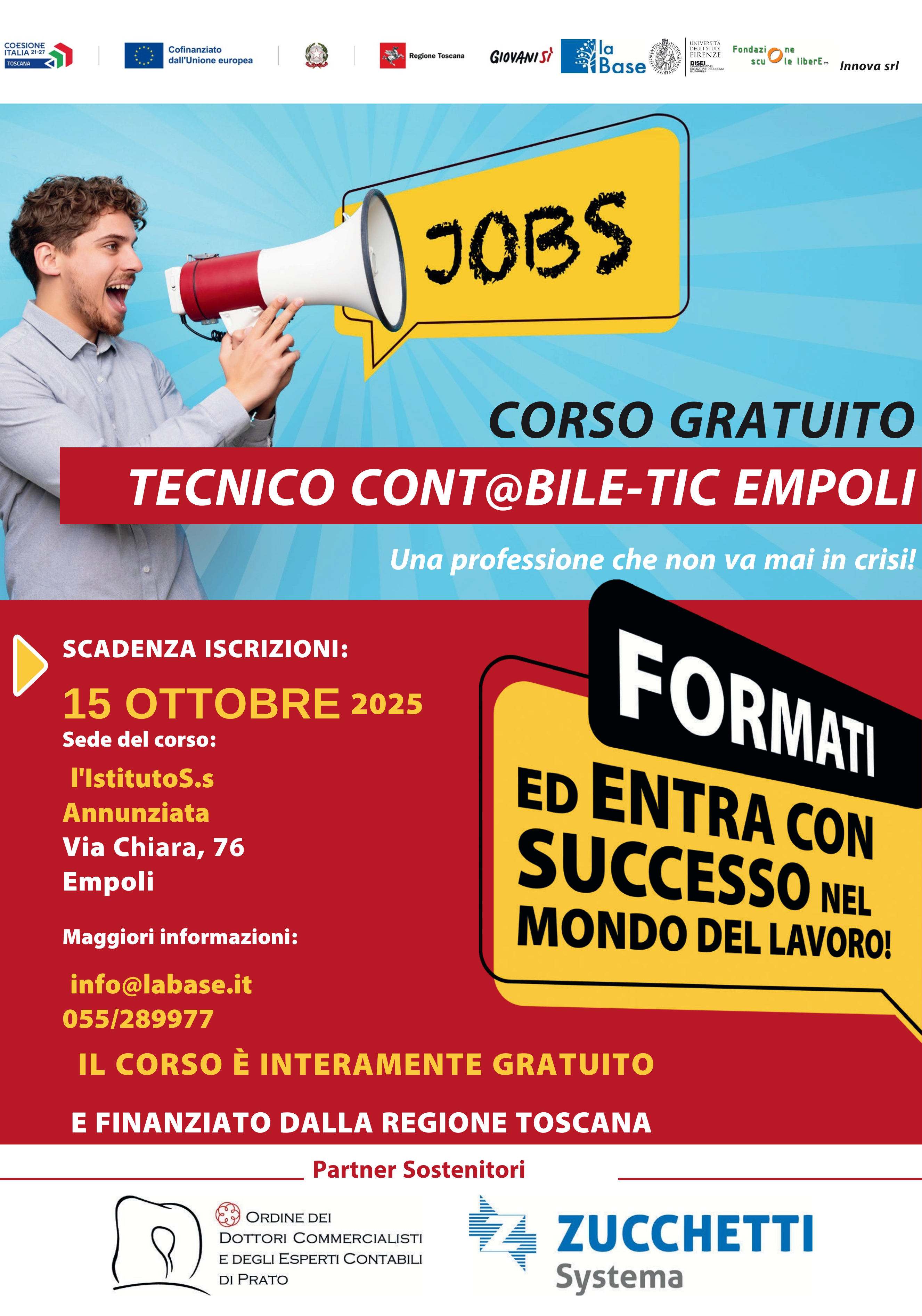 Il corso è interamente gratuito, in quanto finanziato con le risorse del POR FSE TOSCANA 2021-2027 e rientra nell’ambito di Giovanisì (www.giovanisi.it), il progetto della Regione Toscana per l’autonomia dei giovani